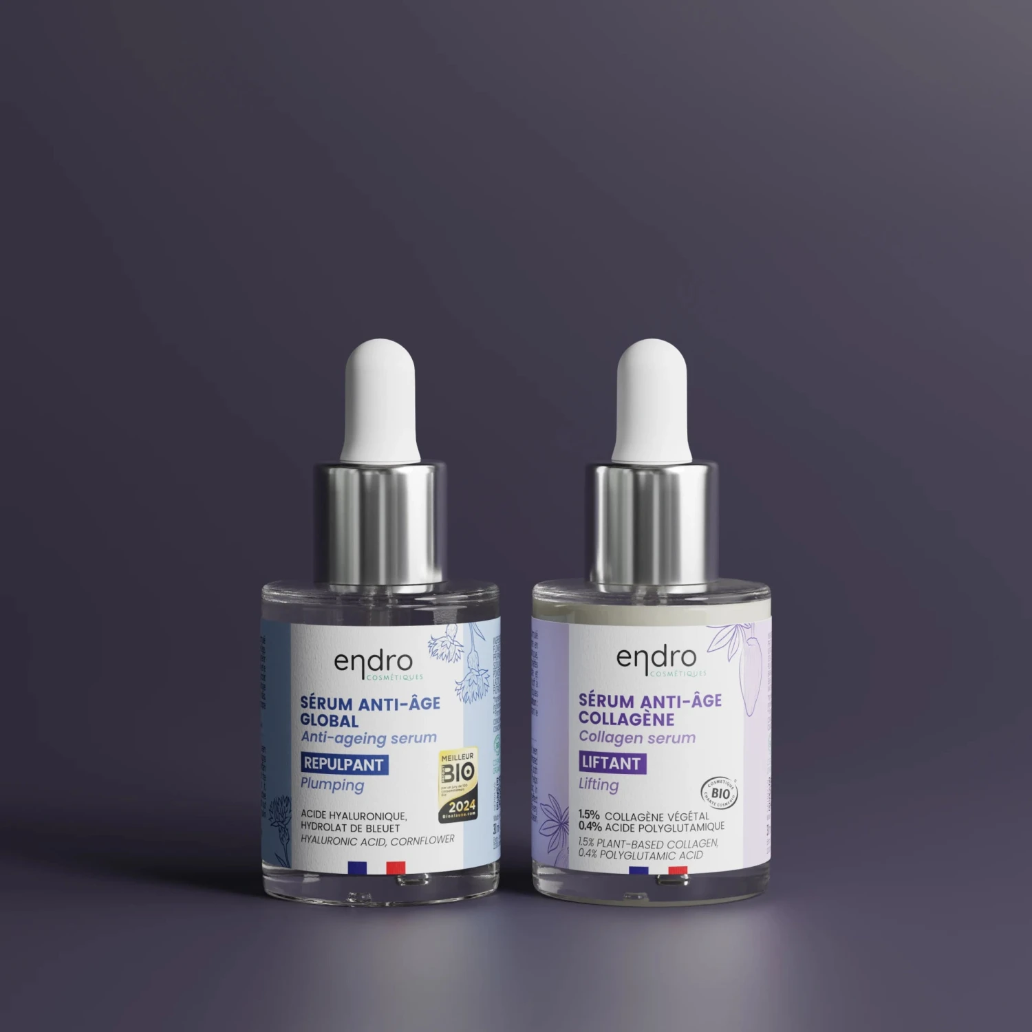 Découvrez nos sérums experts anti-âge et optez pour ce duo spécialement pensé pour les peaux matures ! Notre sérum anti-âge global va venir repulper et réduire l’apparence des rides et ridules. En complément, notre sérum anti-âge collagène va raffermir, lifter et améliorer l’élasticité de la peau, il apporte un effet tenseur immédiat.