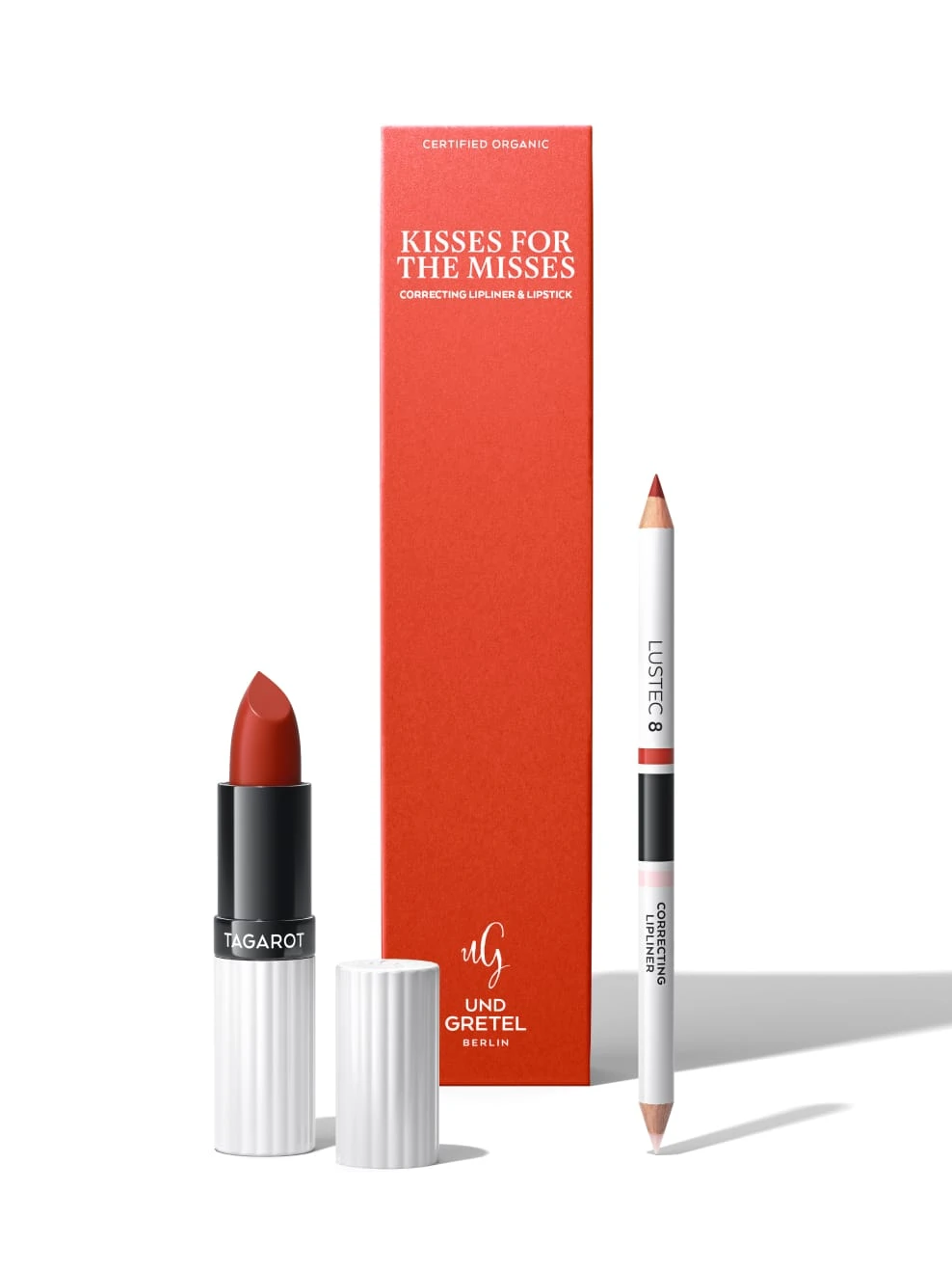 LUSTEC Correcting Lipliner in ORANGE RED 08 (2x 0,52 g) und TAGAROT Lipstick in RED POPPY 08 (3,5 g).