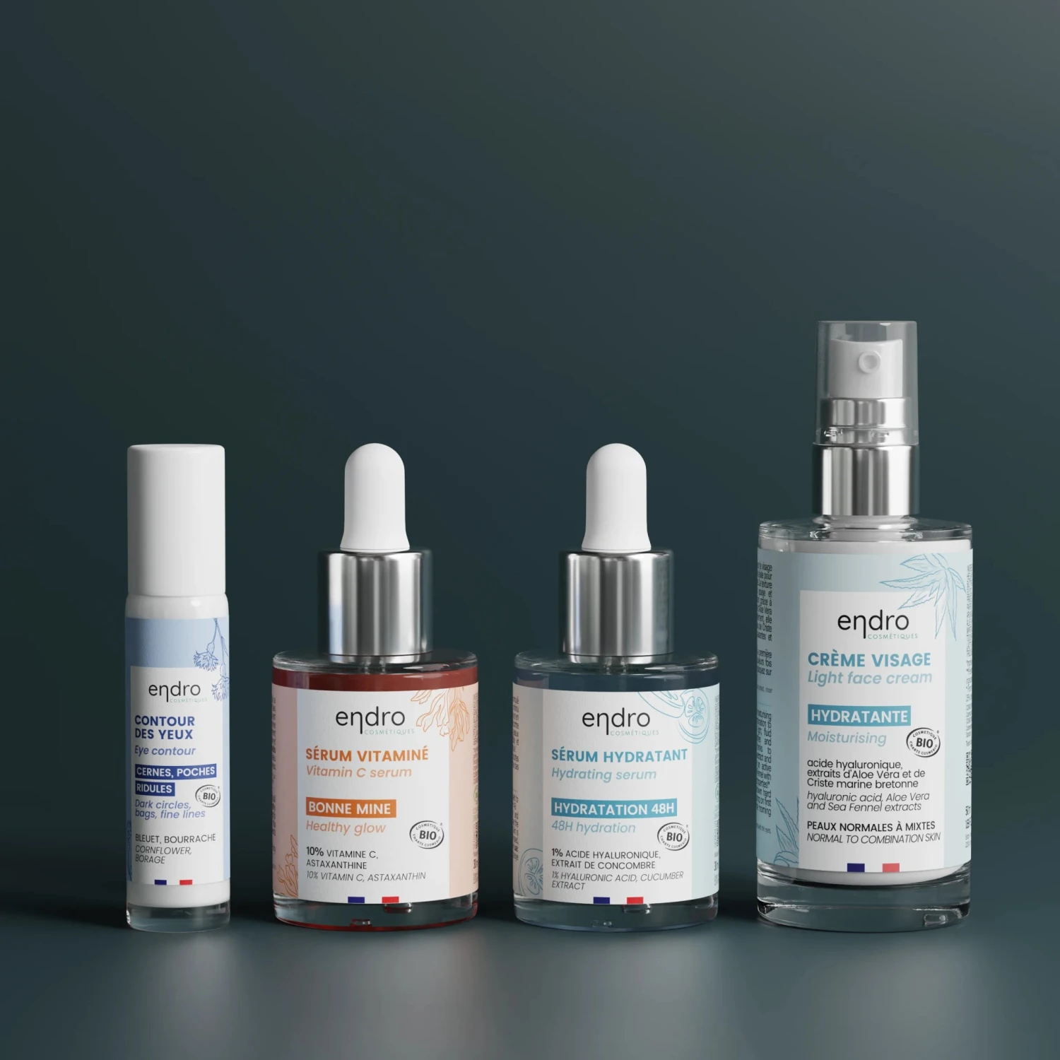 Texture : émulsion légère pour le contour des yeux, gels aqueux pour les deux sérums, crème légère et fluide